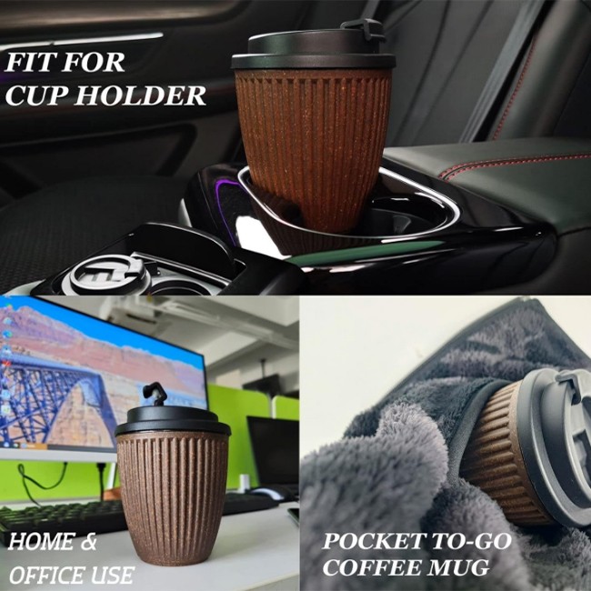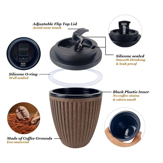 EASY TO CATCH COFFEE GROUNDS RECYCLED PLASTIC TRAVEL COFFEE MUGS WITH LIDS REUSABLE . Double wall insulated plastic coffee mugs with lids reusable made of coffee grounds with wave texture could catch reusable coffee cups with lids easier. Delicate and compact 12oz plastic coffee cups with lids reusable is easy to carry on the go