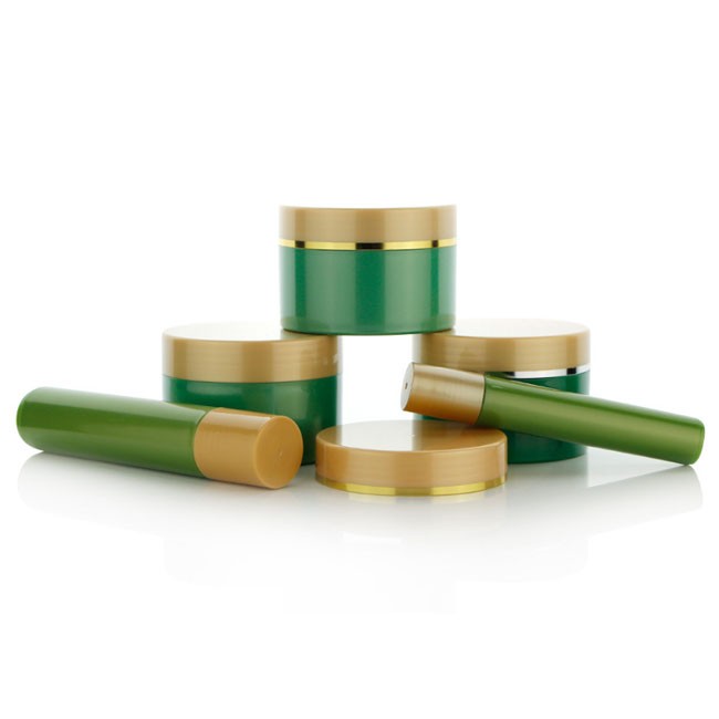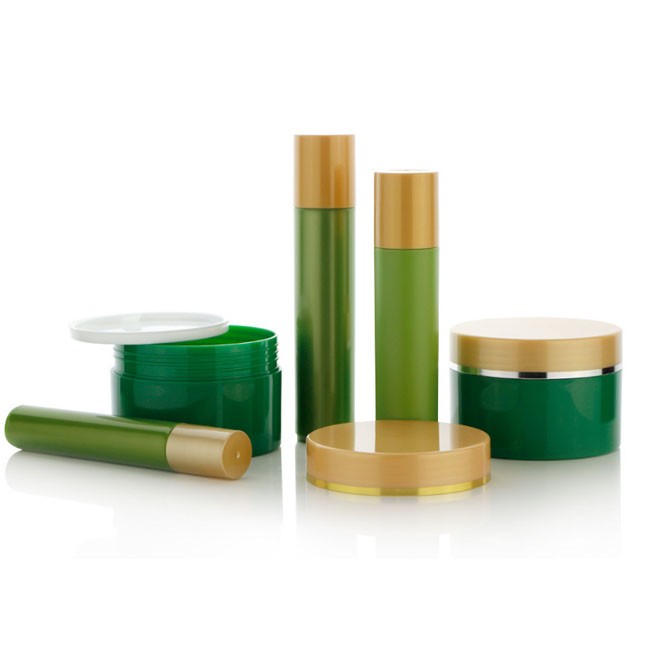 Empty PCR Green Plastic Cosmetic Lotion Jar And Roll On Bottle